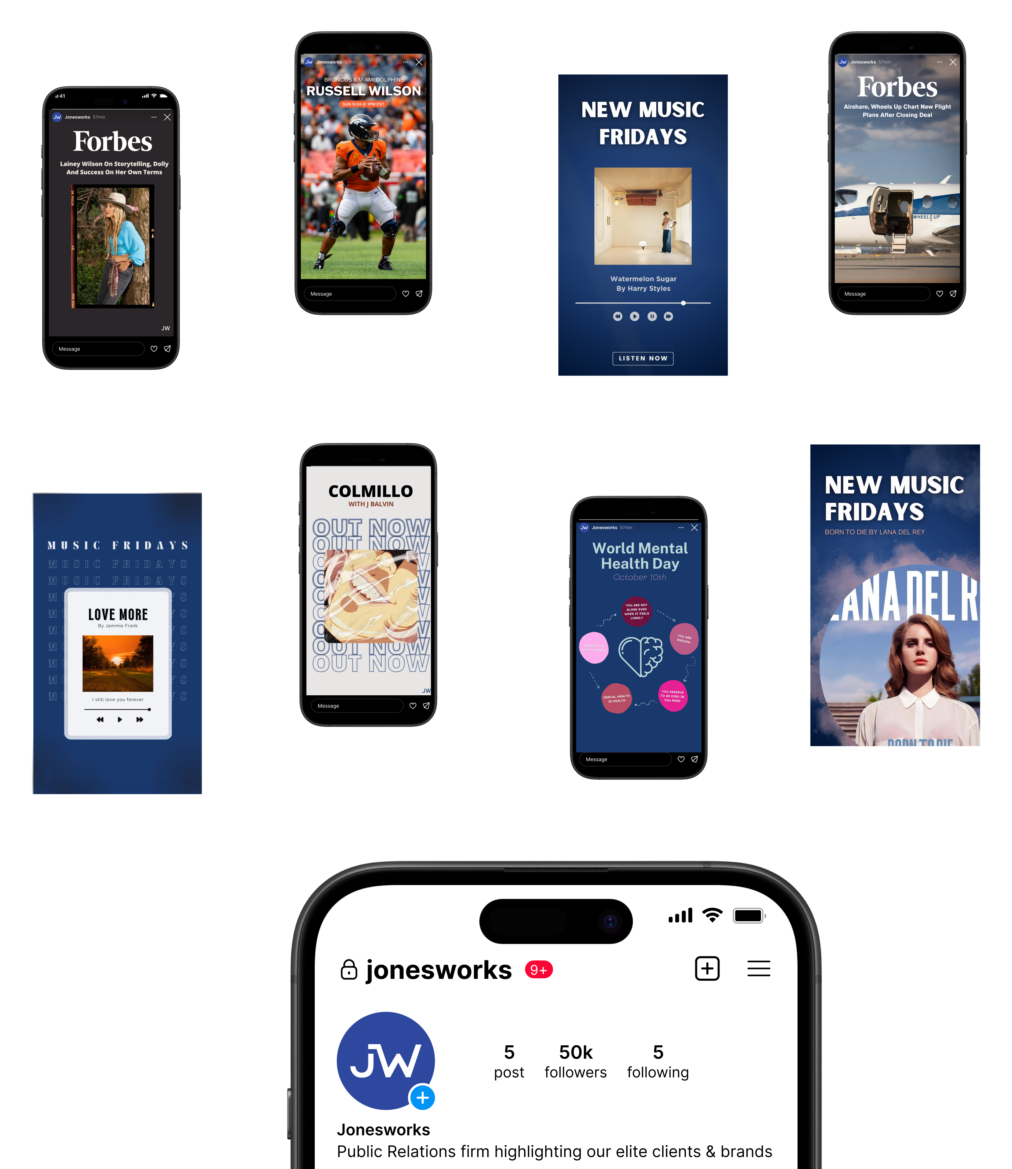 At Jonesworks, a public relations agency, I created social media and branded content for clients across music, entertainment, and celebrity PR. I developed digital assets that aligned with each client’s voice while maintaining Jonesworks’ style.