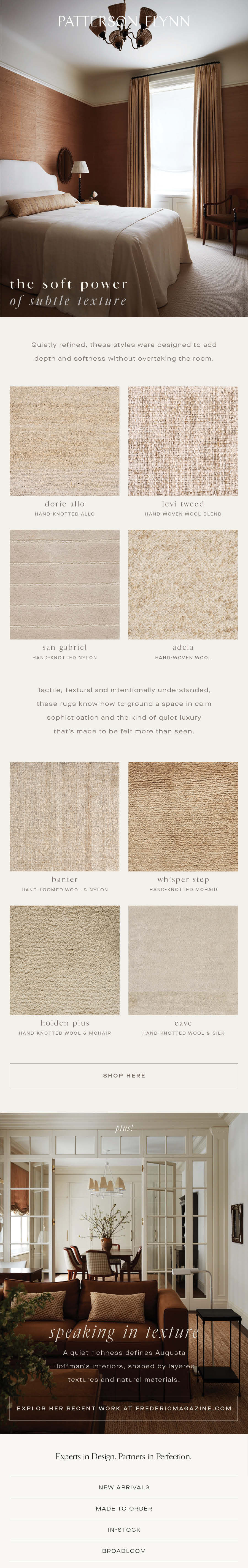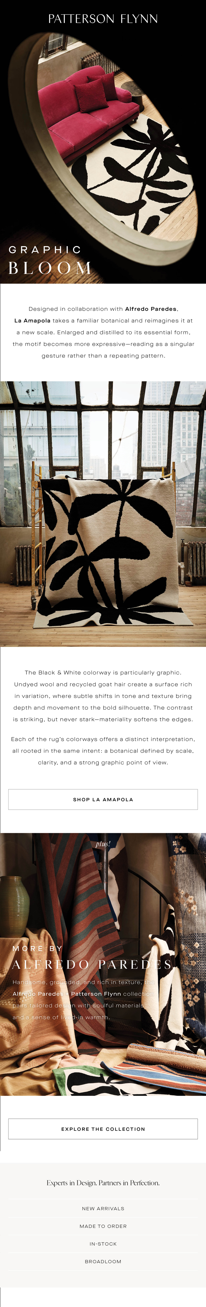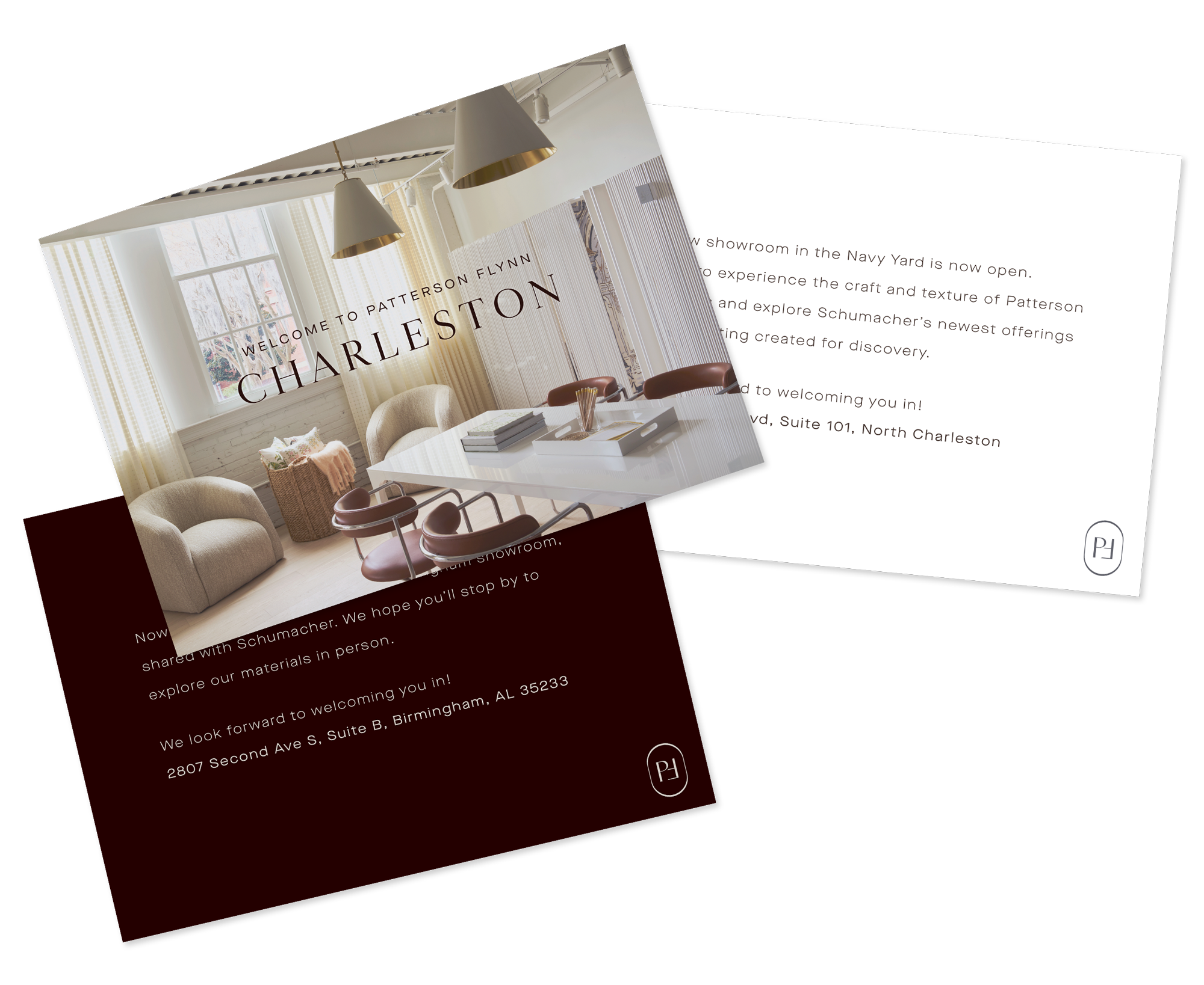For designer collaborations, an initial email campaign was developed, followed by supporting marketing assets. Each collaboration incorporated specific interior design styles. The branding was thoughfully tailored to reflect the visual identity of the designer while remaining aligned with Patterson Flynn’s brand.